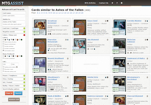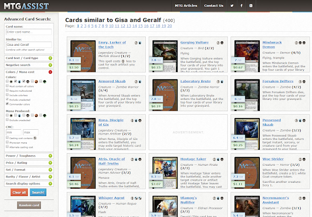 MTG Assist (not to be confused the Assist mechanic ) is a neat site where you can search up a single card, and the site will give you cards that are similar to it, making your search for consistency and redundancy easy and fast!