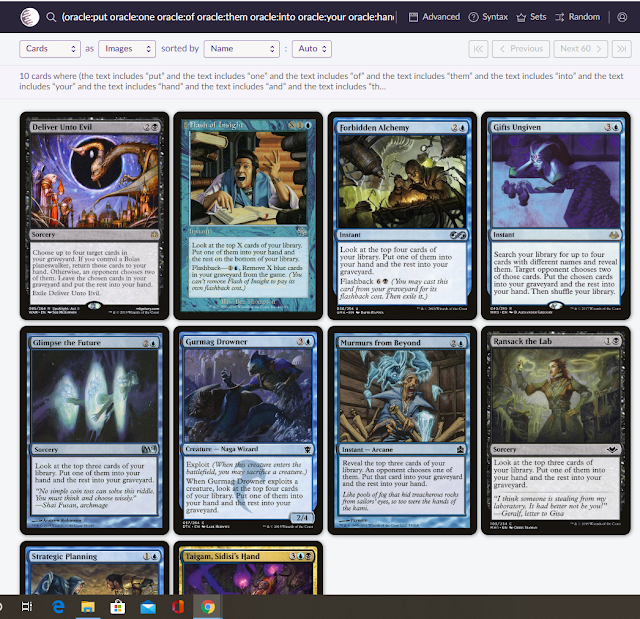For Scryfall specifically, I recommend only the advanced search. A lot of MTG search engines have a bad habit of thinking you want to just look up a card you already know the name of. If I wanted to do that, 99.9% I would just use Google once and move on. So just skip to the advanced search so you can look up text. Let’s suppose I wanted effects like Taigam, Sidisi's Hand, specifically the “put one of them into your hand and the rest into your graveyard” draw part. I can plug that into the advanced “text” search, which gives me: