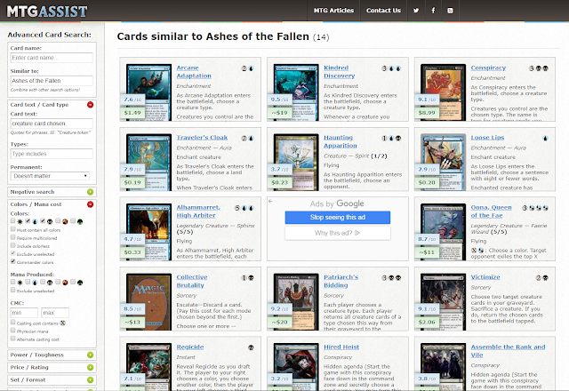 Now then, let’s go back to MTG Assist. Suppose I want redundancy for Ashes of the Fallen. Using the same search parameters, I can plug in Ashes of the Fallen and get: