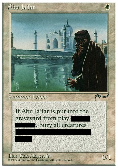 One of my playgroups had a member who ran Abu Ja'far in his deck. This led to ongoing jokes about how Abu Ja'far is the best card ever and if it resolves for someone, victory is assured.
