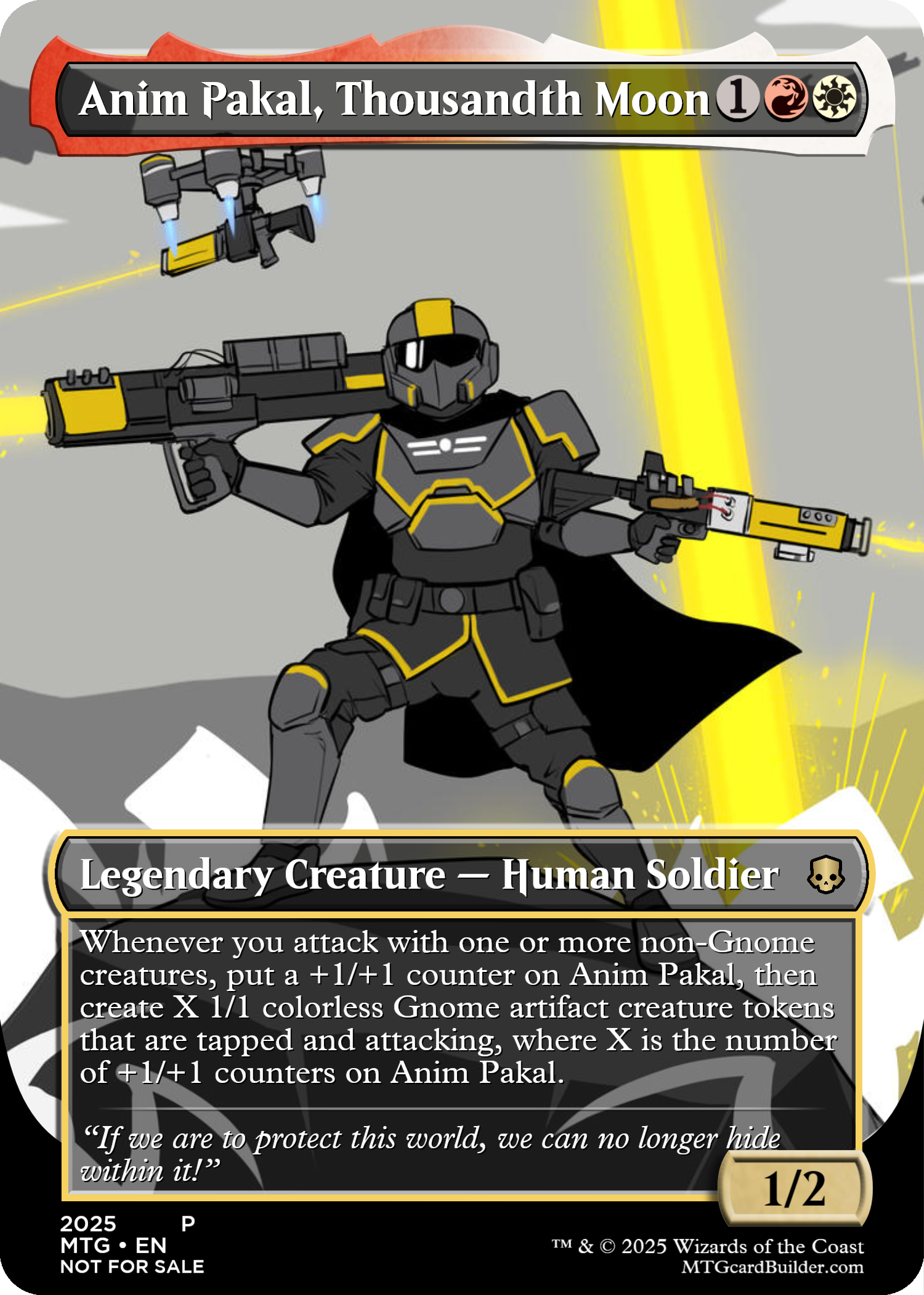 Whenever you attack with one or more non-Gnome creatures, put a +1/+1 counter on Anim Pakal, then create X 1/1 colorless Gnome artifact creature tokens that are tapped and attacking, where X is the number of +1/+1 counters on Anim Pakal.