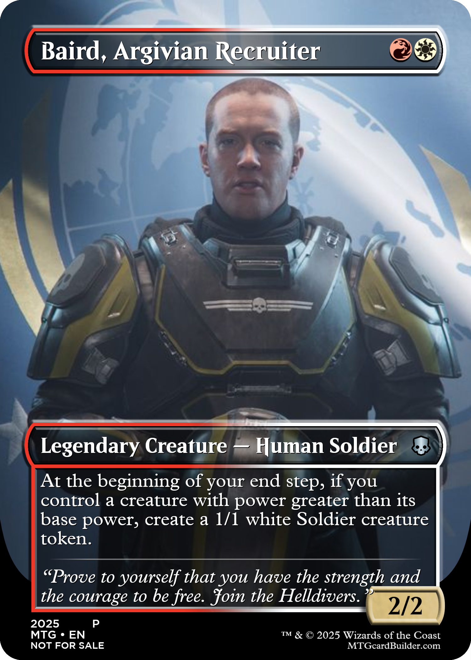 Baird, Argivian Recruiter - 4 copies too many as it is legendary and the tokens it makes are not really feeding into other strats. If you want to place focus on Boaird, would suggests different deck style.