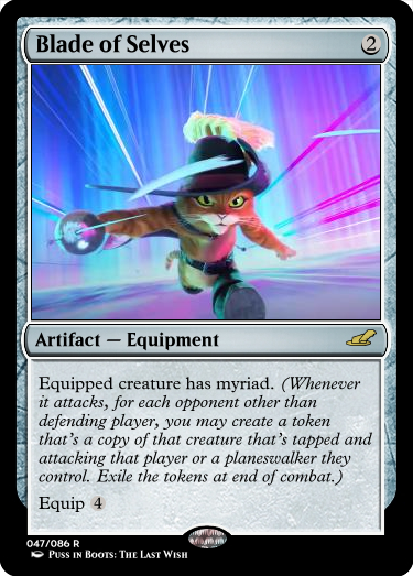 Equipped creature has myriad. (Whenever ts creature attacks, for each opponent other than defending player, you may put a token that's a copy of this creature onto the battlefield tapped and attacking that player or a planeswalker he or she controls. Exile the token at the end of combat.)
