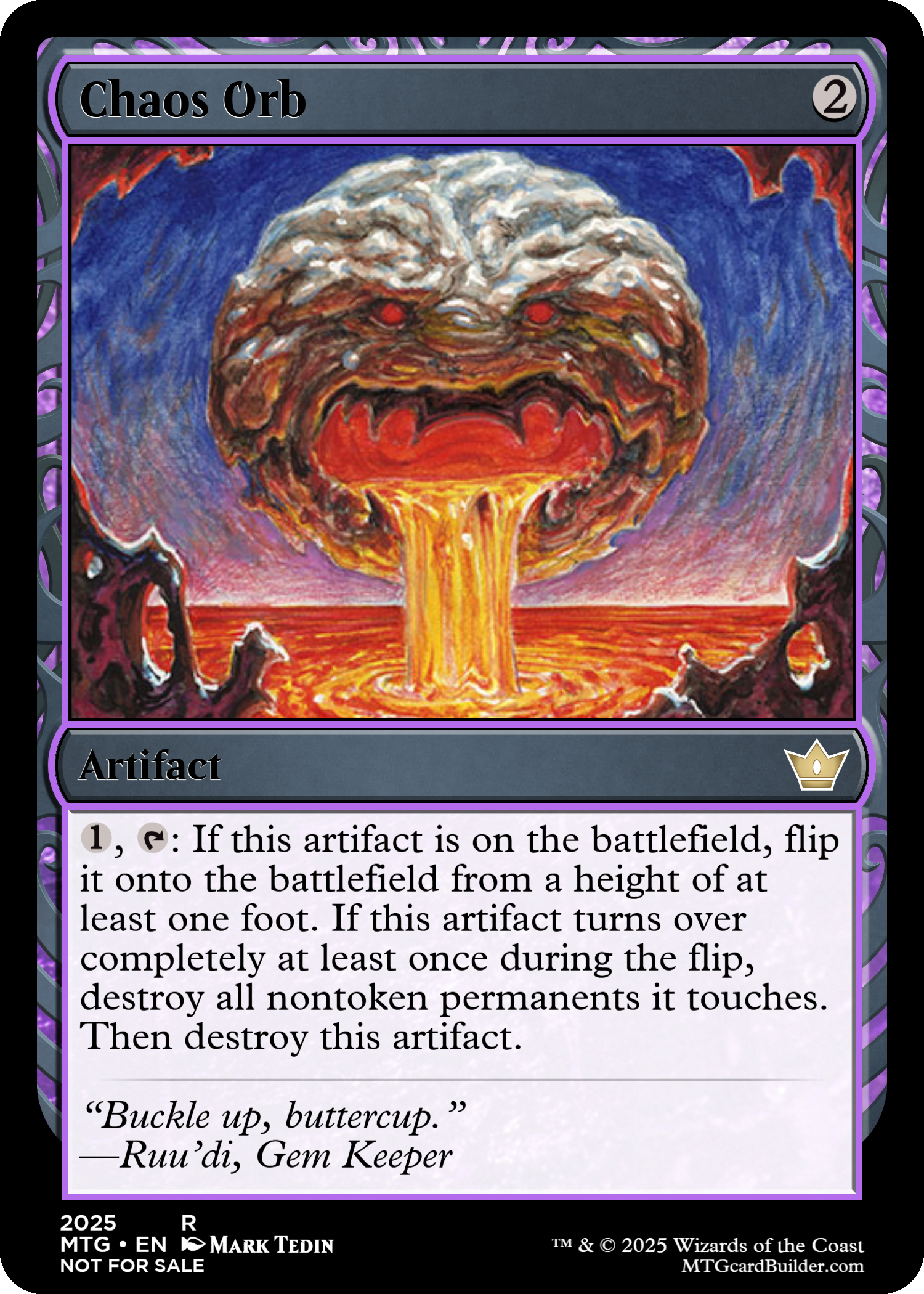 , : If Chaos Orb is on the battlefield, flip Chaos Orb onto the battlefield from a height of at least one foot. If Chaos Orb turns over completely at least once during the flip, destroy all nontoken permanents it touches. Then destroy Chaos Orb.
