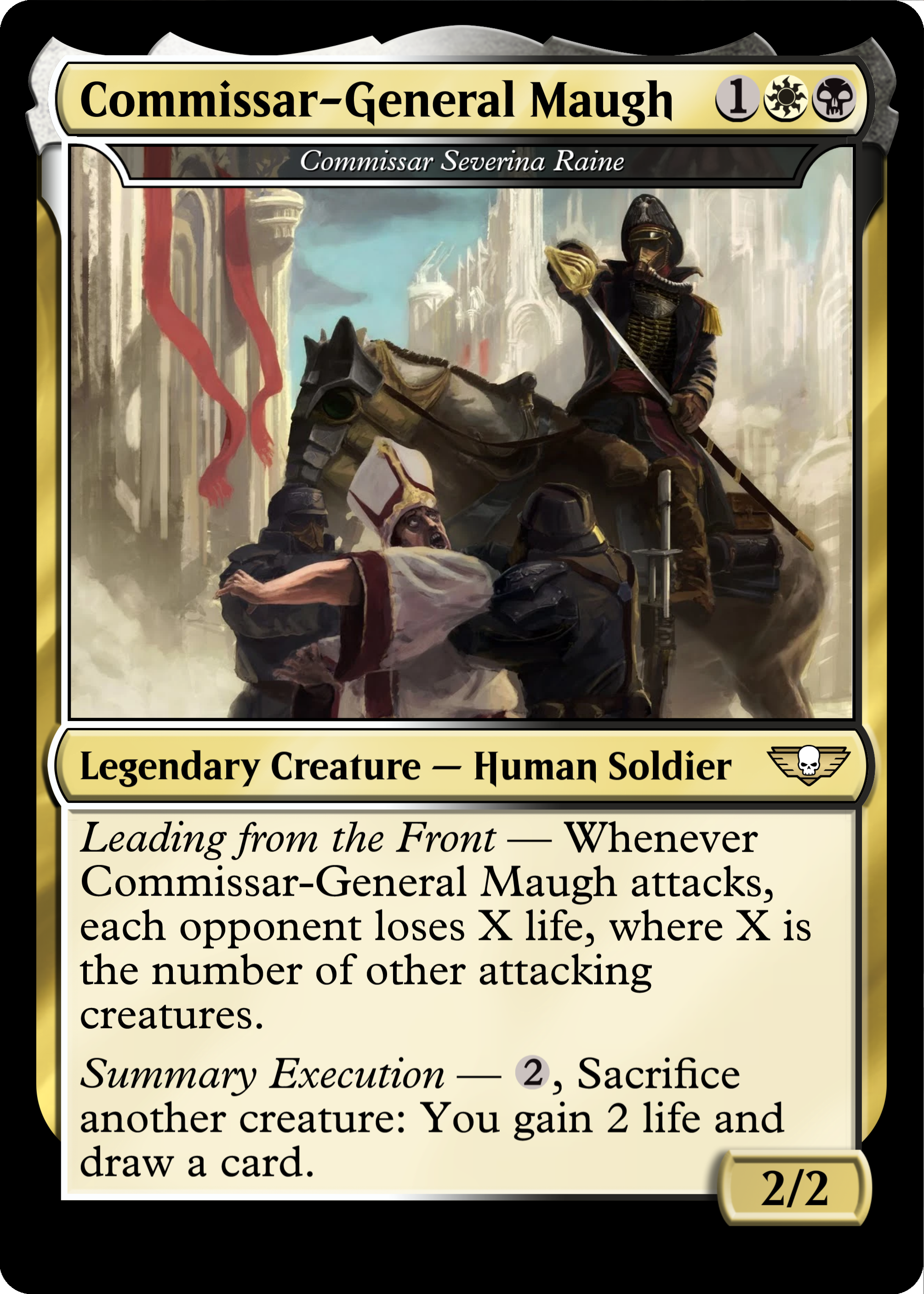 Leading from the Front — Whenever Commissar Severina Raine attacks, each opponent loses X life, where X is the number of other attacking creatures.