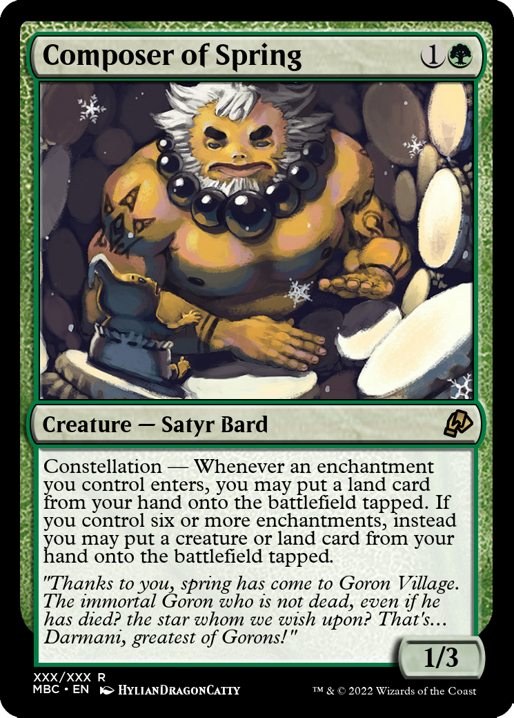 Constellation — Whenever an enchantment enters the battlefield under your control, you may put a land card from your hand onto the battlefield tapped. If you control six or more enchantments, instead you may put a creature or land card from your hand onto the battlefield tapped.