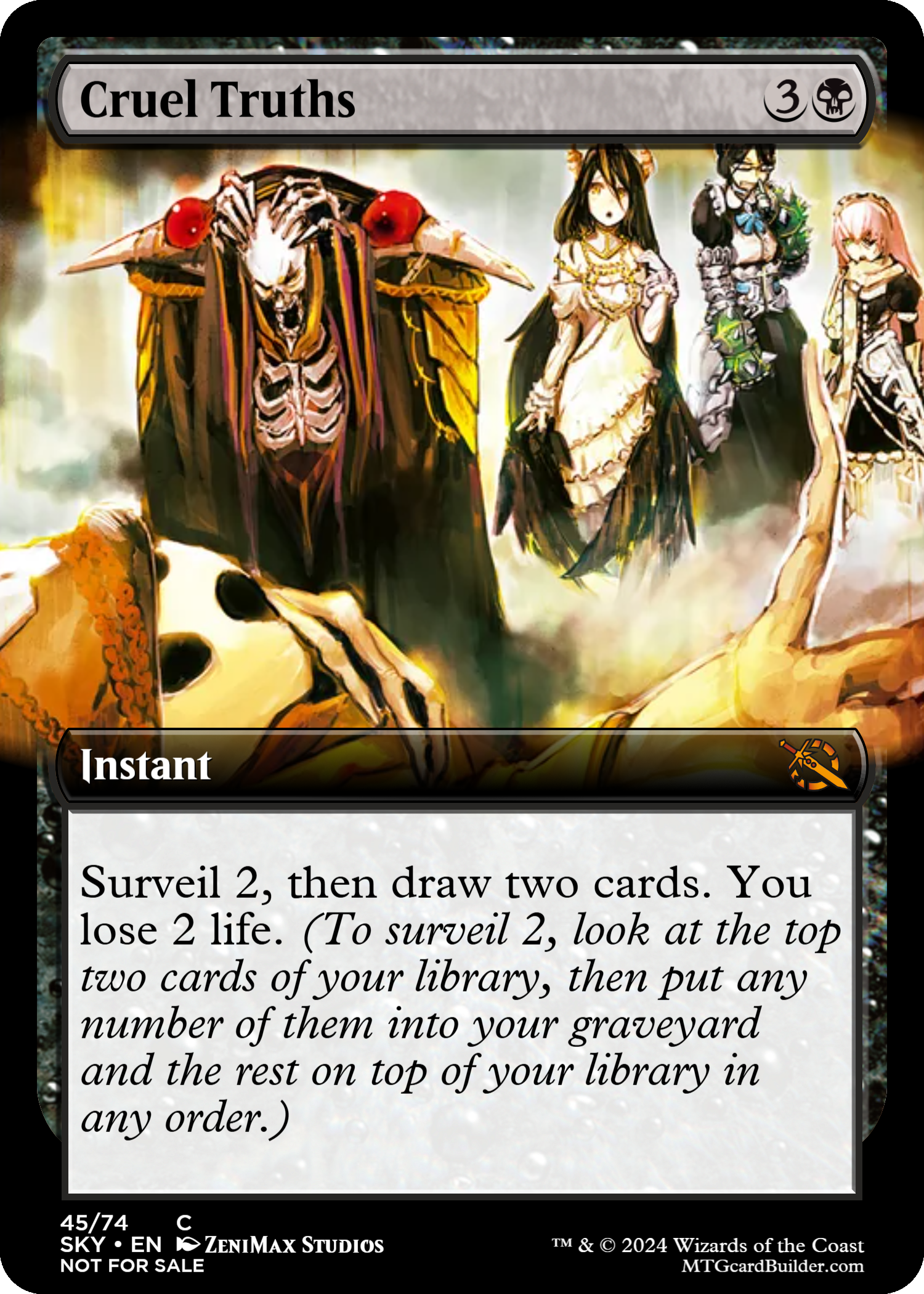 Surveil 2, then draw two cards. You lose 2 life. (Look at the top two cards of your library, then put any number of them into your graveyard and the rest back on top of your library in any order.)