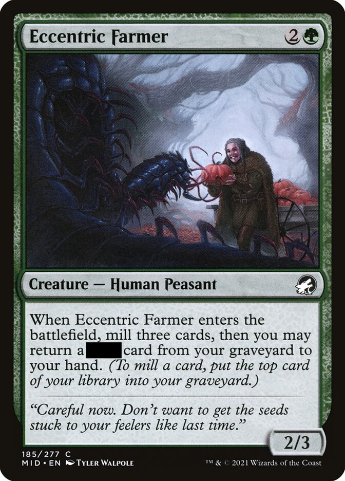 Eccentric Farmer does double duty filling our graveyard and recurring lands to meet our drops, so traded out one Stinkweed Imp and a Thoughtpicker Witch (who I’ve almost never needed to use in playing this list). With Farmer helping us meet our land drops better, dropped the two cycling lands to make room for a pair of Kitchen Imps to push early game aggro. Lastly, ditched the Perilous Myr for a big beatstick in Writhing Necromass to contend against the likes of Gurmag Angler or potentially even bigger creatures.