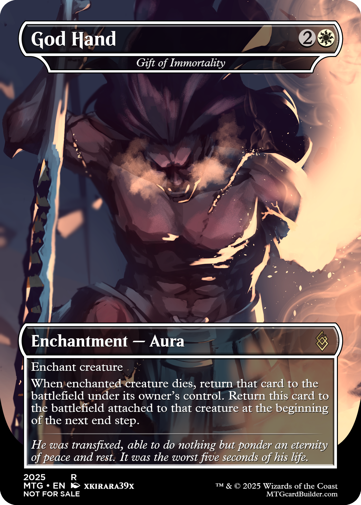 Gift of Immortality : This card has lot of potential, i think this card has been glanced over because if you're not careful you don't realize it's every end step and not only yours. Even if used on a one mana afterlife 1 fodder, in a turn rotation of a 4 players game it would already have payed for itself (4 recursion of 1 mana creatures for 3 mana). In this deck it's like a better version of Ophiomancer. Others awesome targets would be Market Gnome, Ranger-Captain of Eos, Elenda, the Dusk Rose, Hallowed Spiritkeeper, Kokusho, the Evening Star (for those that play it like me). Or can be used as a protection for sacrifice engine, a draw engine, a blood artist effect or Teysa. With flash or an ability to chose of make it comeback to your hand instead of attached to the creature i think it would be a no brainer.