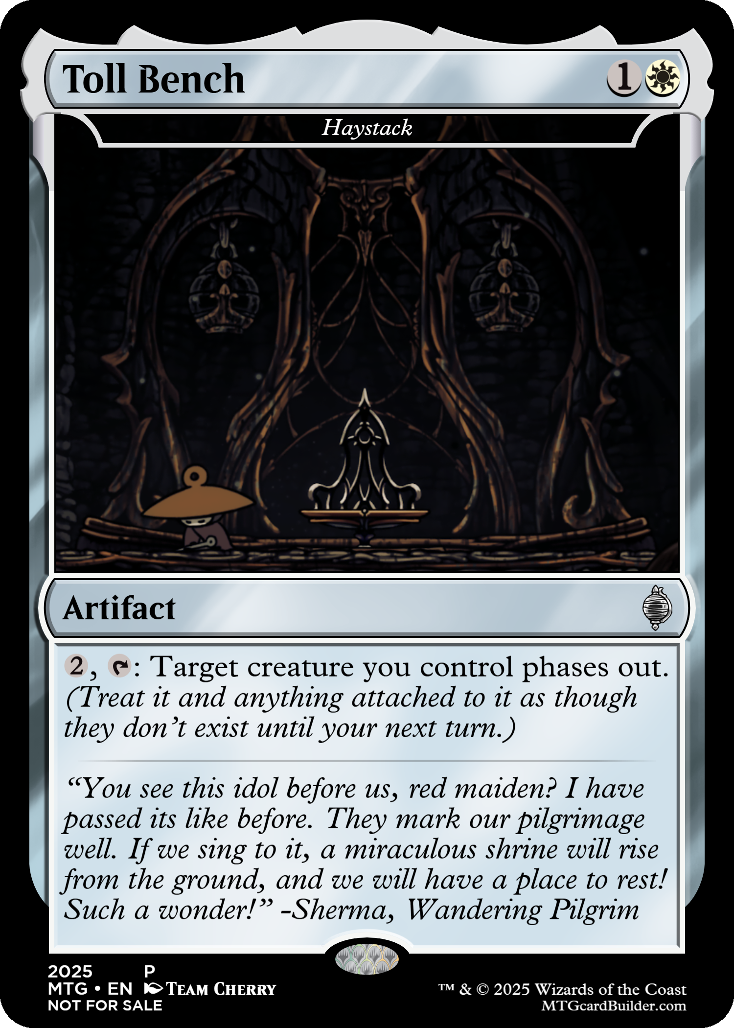 Haystack is nice. Reminds me of Mother of Runes, but cannot protect itself or provide evasion. Keep in mind that it cannot target our creatures that have protection from white since it’s considered a white artifact, and with it not being a creature, it cannot be equipped. There is the advantage of having the ability to use it the same turn it comes out. I can see a common play pattern of playing Haystack prior to playing the threat, and leaving up the additional two mana of course. I know we were also trying to keep our artifact count down and I am curious what we would take out for it. I do like that it can make one of our creatures dodge practically any board wipe. Phasing has some advantages over hexproof, indestructible, and color protection. Timing can be a bit of a challenge not having our threat return to defend us until our next untap rather than the end of the turn we use the Haystack. Not a fan of having to keep up mana up when there’s things like Giver of Runes, which can activate for free (and also did not currently make the deck). I would probably recommend adding Haystack if your playgroup is removal heavy, otherwise it’s a bit too defensive to speed up our game plan of taking out our opponents. I am personally more of a fan of spells/abilities that I can use that can protect our commander without interrupting a lethal attack, like a new card I pulled yesterday Flare of Fortitude