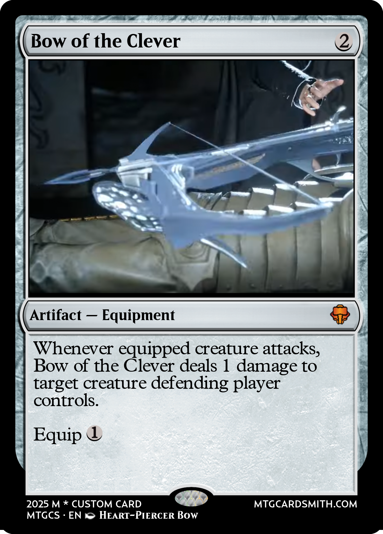 Whenever equipped creature attacks, Heart-Piercer Bow deals 1 damage to target creature defending player controls.