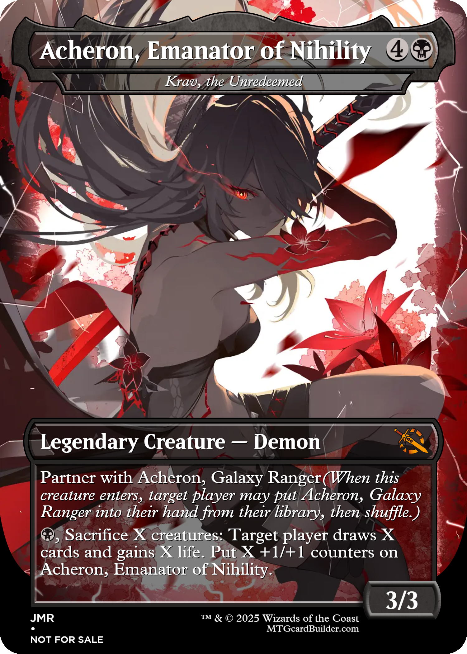In the long run, I’d love to add some heavier hitters and staples like Kindred Dominance, Altar of Shadows, Bontu's Monument, Krav, the Unredeemed, Rite of Belzenlok, Demonic Tutor, Sudden Spoiling, Grave Pact, Dark Prophecy, Attrition, Vilis, Broker of Blood, Razaketh, the Foulblooded, Pestilence Demon, Lord of the Void, Archfiend of Depravity, and especially Karlach, Fury of Avernus.