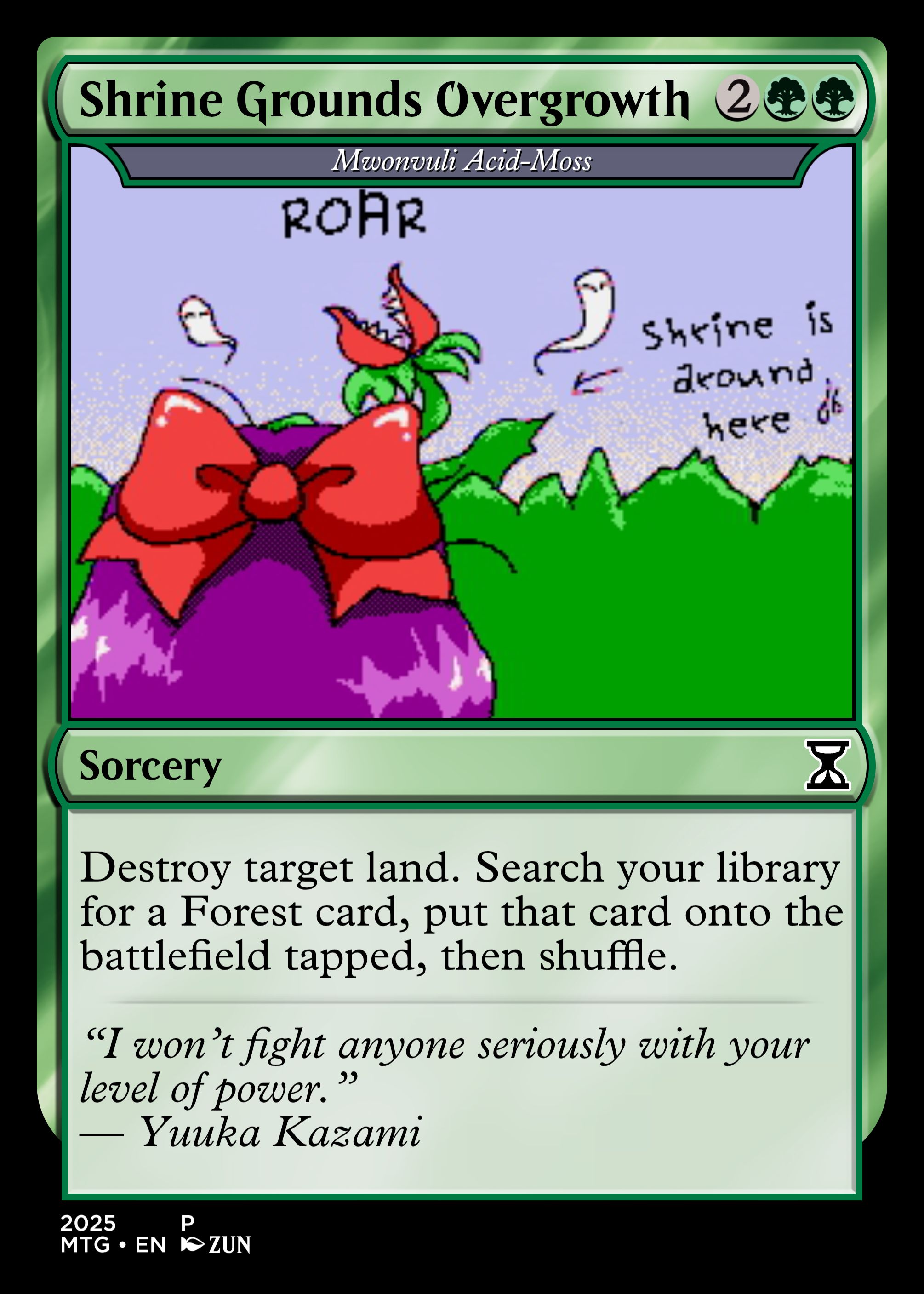 amarthaler Hey thanks! Lol I'm surprised you found this I haven't deckcycled it at all yet... Right so I built this around Mold Shambler being a Sowing Mycospawn impersonation for pauper since land destruction on a body is really good for obvs. reasons. So far the deck seems to be able to ramp into them pretty well, if you curve out perfect it's Turn 1 Arboreal Grazer > Turn 2 Thermokarst > Turn 3 Mwonvuli Acid-Moss > Turn 4 kicked Mold Shambler, so that feels pretty sick when it happens. And Faultgrinder is there to infinitely recur using Evolution Witness+Treetop Snarespinner blowing up lands every turn at the top end. Thresher Beast is a cool rec but I think it might fall a bit short in the face of killspells, since it has an attack trig and not an ETB? Thanks for checkin' out the deck!