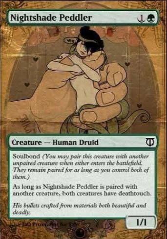 Soulbond (You may pair this creature with another unpaired creature when either enters the battlefield. They remain paired for as long as you control both of them.) As long as Nightshade Peddler is paired with another creature, both creatures have Deathtouch.
