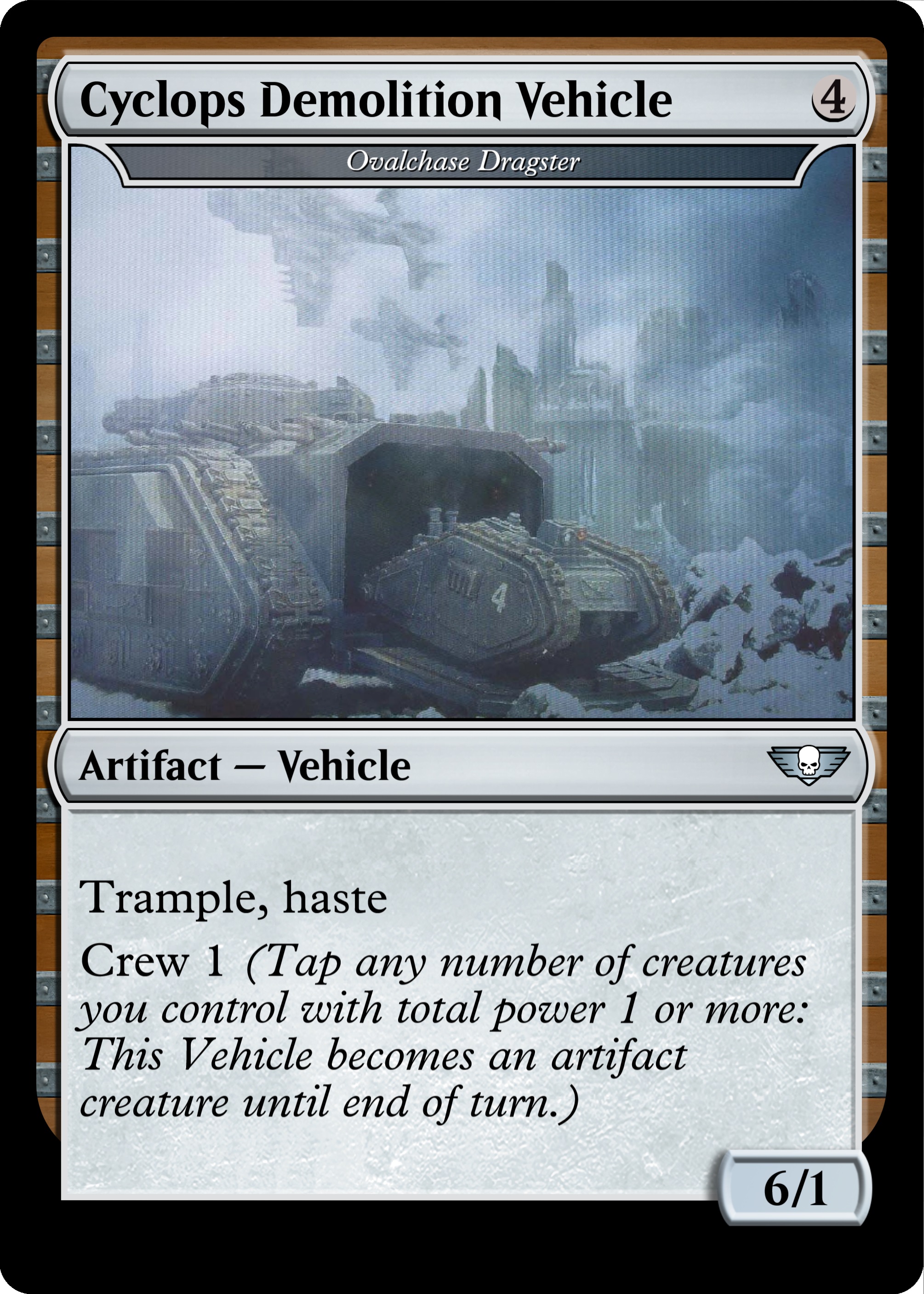 I can really see a screaming goblinn behind the wheel of an Ovalchase Dragster and goblins-in-tanks is not only funny but a Mobile Garrison gives you an extra untap with Krenko. I'm thinking about downgrading my Goblin deck a bit to add pet dinosaurs as well. If Krenko is dead nobody is worried when I play goblin, pass turn, goblin, pass turn, Charging Monstrosaur AAAAAAAARGH!