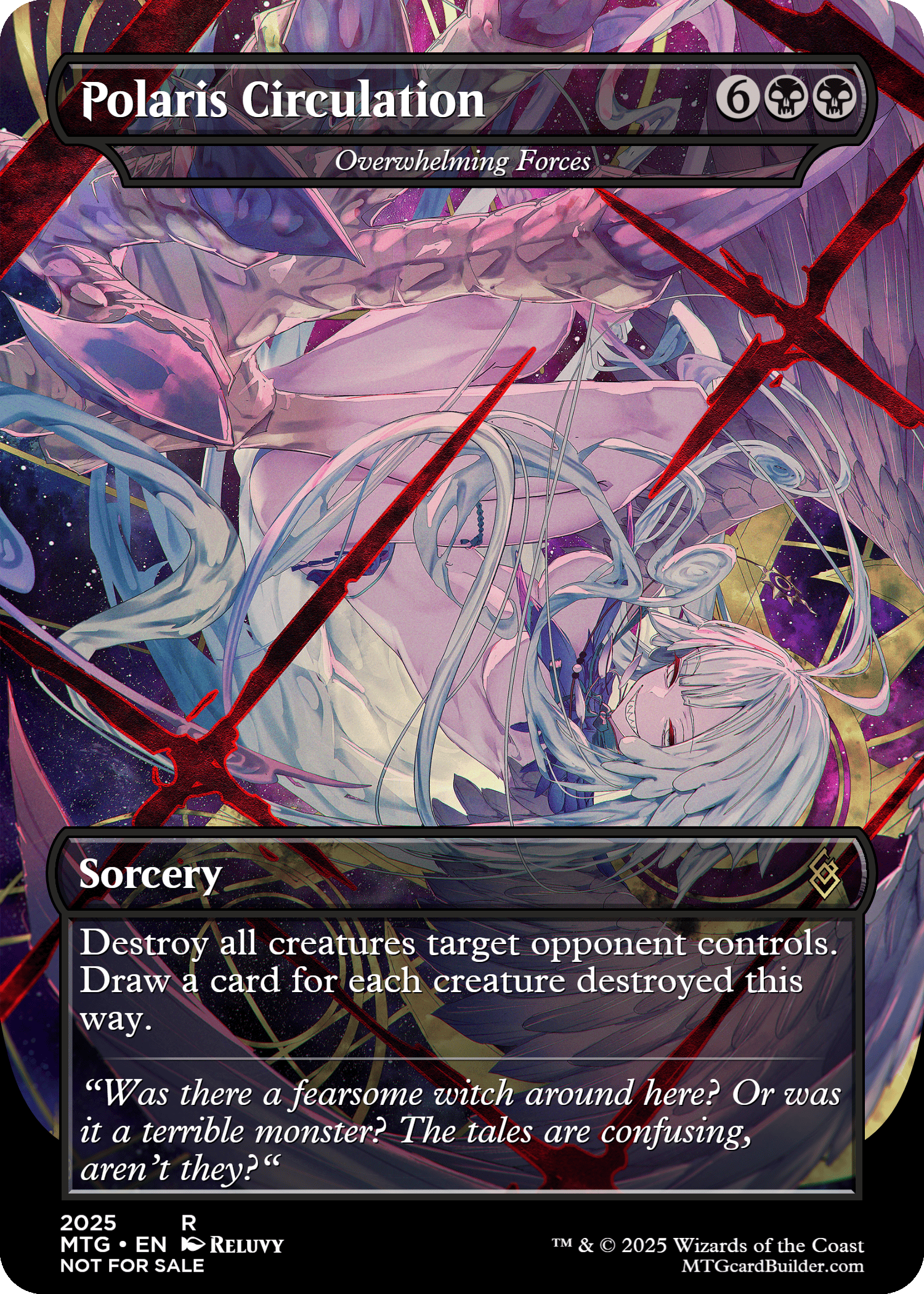 I dont view Overwhelming Forces as a boardwipe but as a high priced removal spell. There's already 3 other cards that boardwipe in Damnation, The Meathook Massacre, and Portal to Phyrexia. With the high card draw of the deck, we're likely to have 1 of them if we find ourselves in that sticky situation. However since this deck has access to so many mana doublers, its not unlikely for us to have the to throw around so is quite playable in comparison to other deck-types. It doesnt destroy our board like how Decree of Pain does, so we keep momentum while crippling the best opposing boardstate.