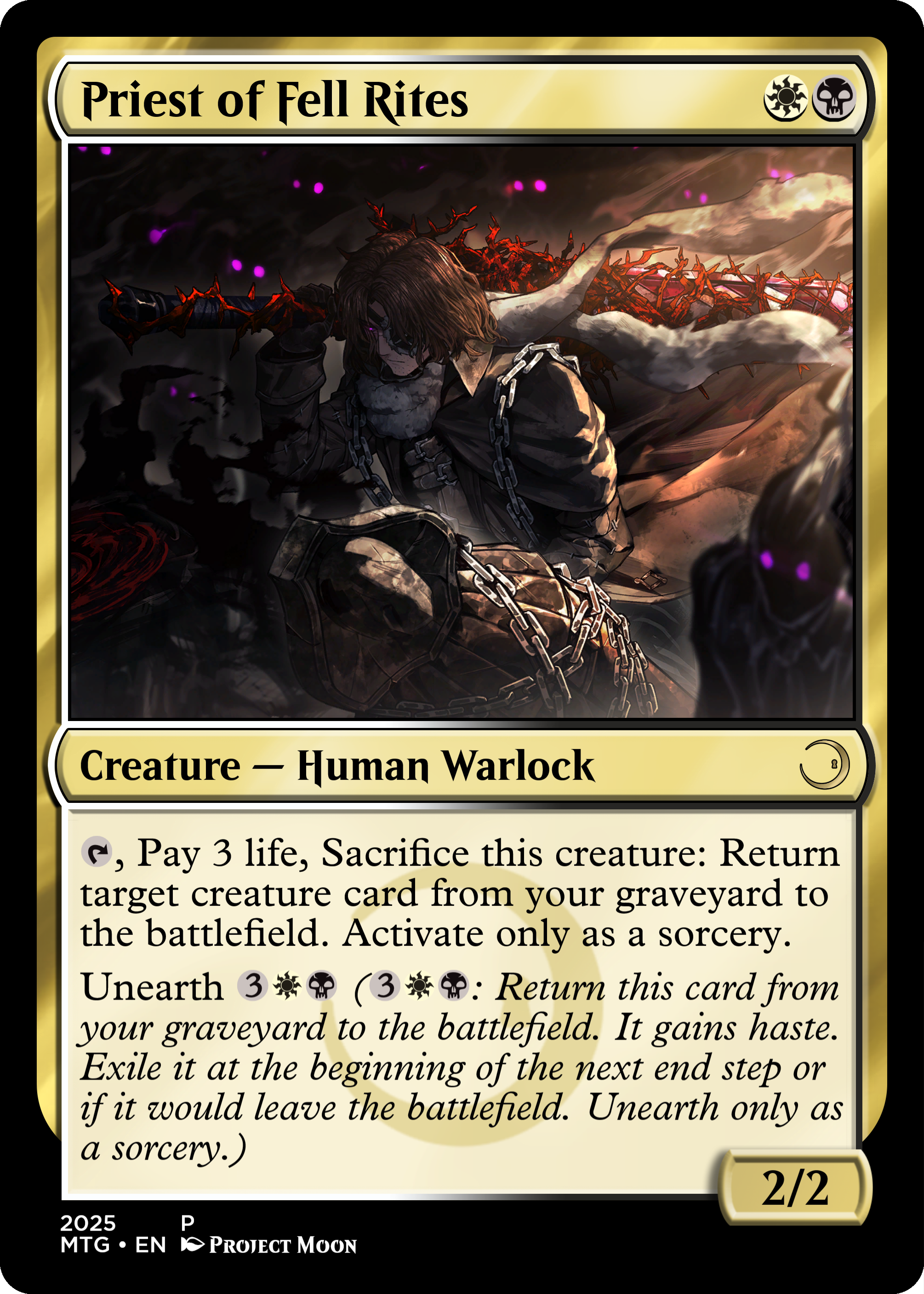 Yo, was thinking about it more and was trying to come up with 2 drops. I'm sure you thought about a bunch of these, but the only one I'd say might be important to a deck like this is Priest of Fell Rites, since I think you'll need to hold onto your big creatures, and having a reanimate is nice. maybe also including Reanimate? Boring, but would probably be good lol.