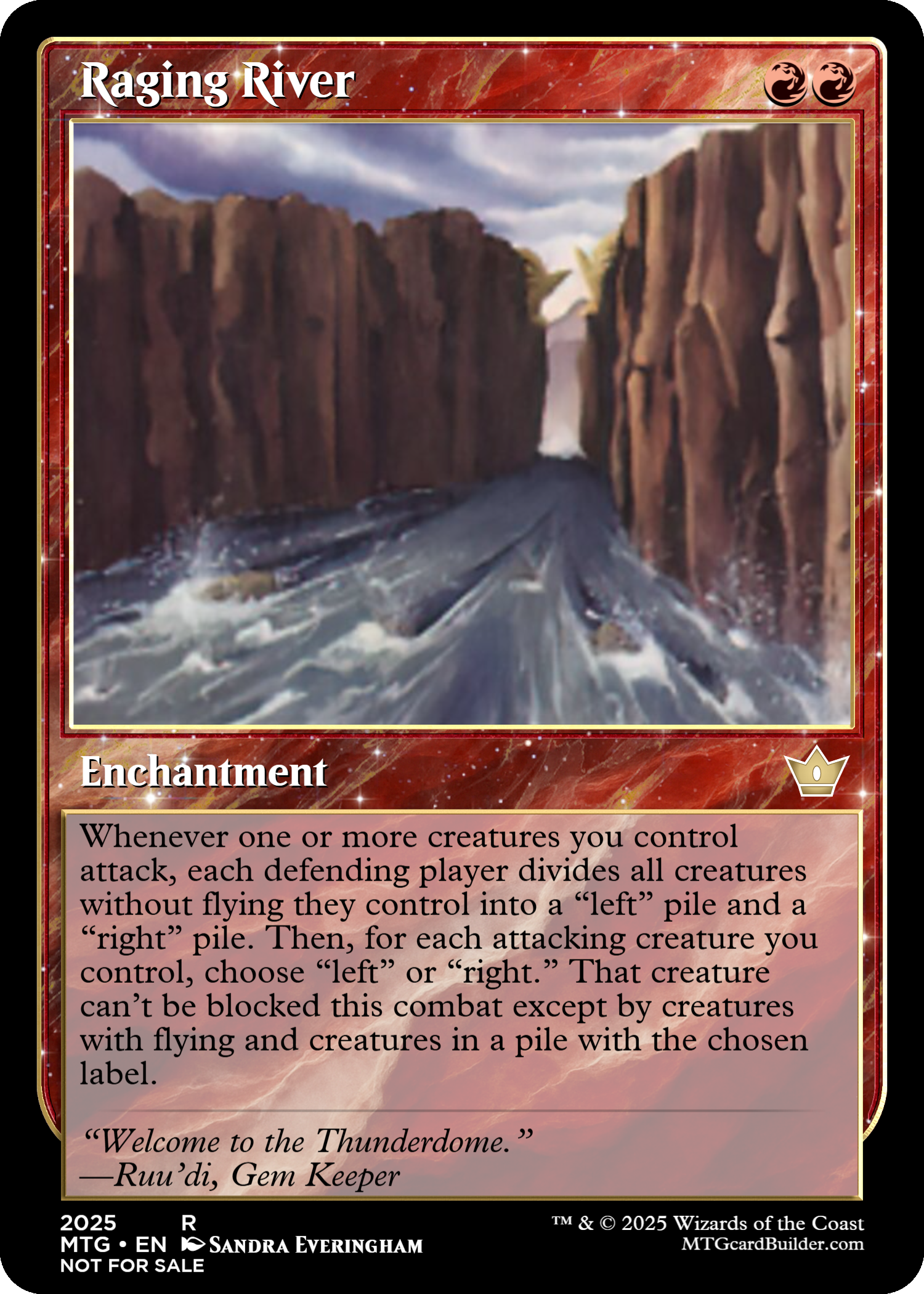 @kamarupa I’ve settled on a worthy candidate. If I were to ask him to build around something (which I won’t because I don’t know him well enough to impose), I can think of no better card than Raging River. It’s as stupid and obtuse as Falling Star with a similar element of real world physicality, but it’s actually legal to play.