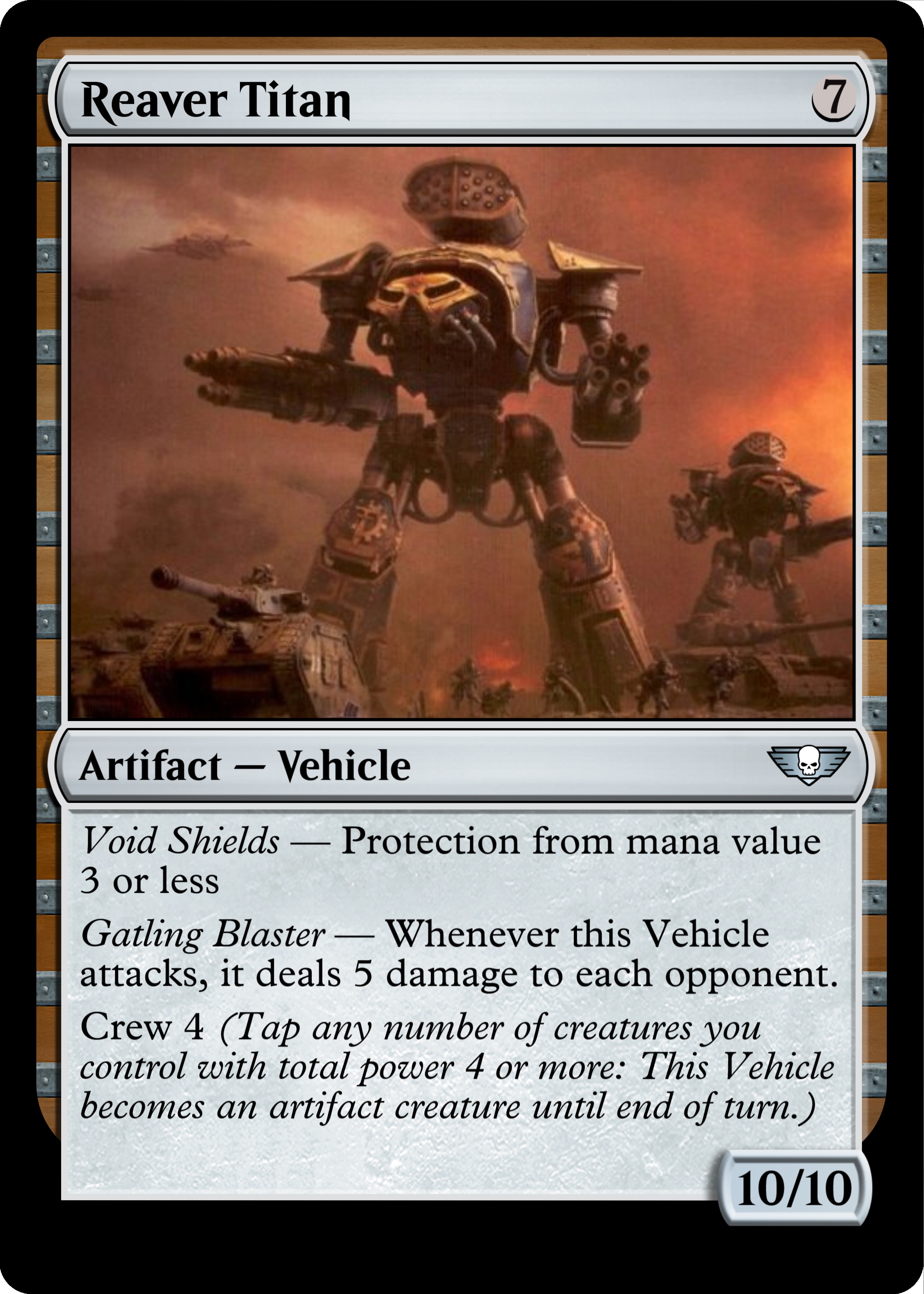 Gatling Blasting — Whenever Reaver Titan attacks, it deals 5 damage to each opponent.