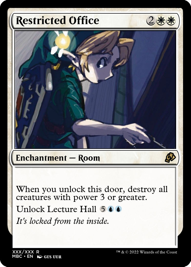 (You may cast either half of this spell, unlocking the door to that room when it enters. This card has the abilities, colour and mana cost of that room. As a sorcery, you may pay the mana cost of a locked door to unlock it. The abilities, colour and mana cost of that door are added to this permanent. If this enchantment enters without being cast, both rooms will be locked. Copying this enchantment also copies the locked status of the rooms.)