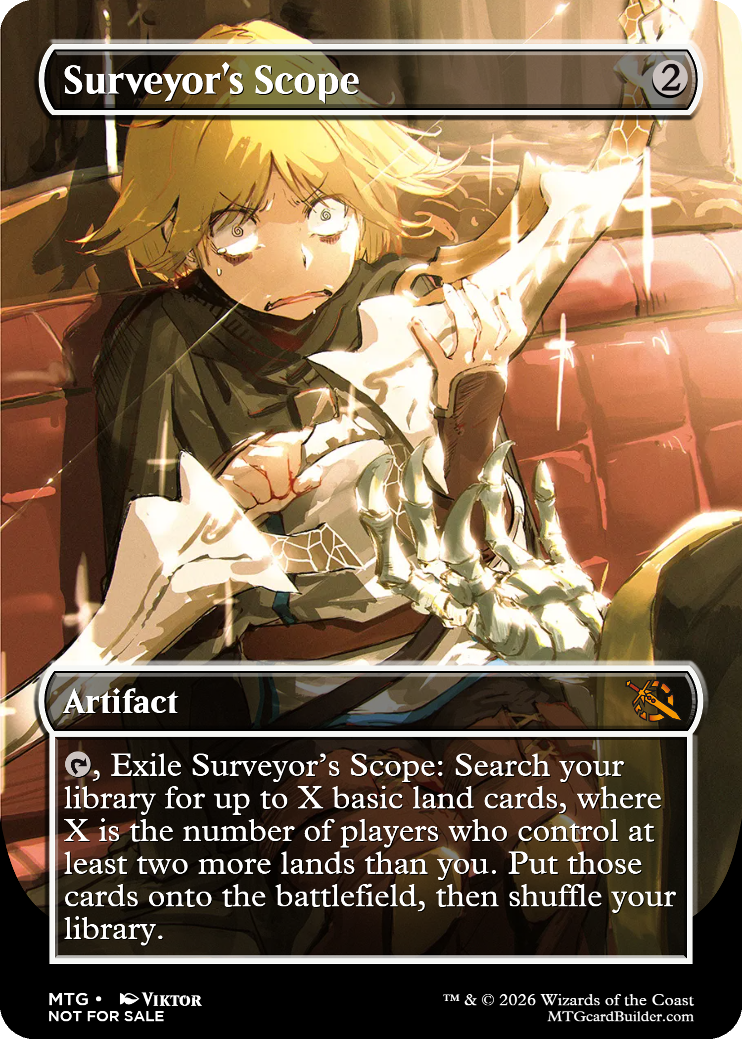 {T}, Exile Surveyor's Scope: Search your library for up to X basic land cards, where X is the number of players who control at least two more lands than you. Put those cards onto the battlefield, then shuffle your library.