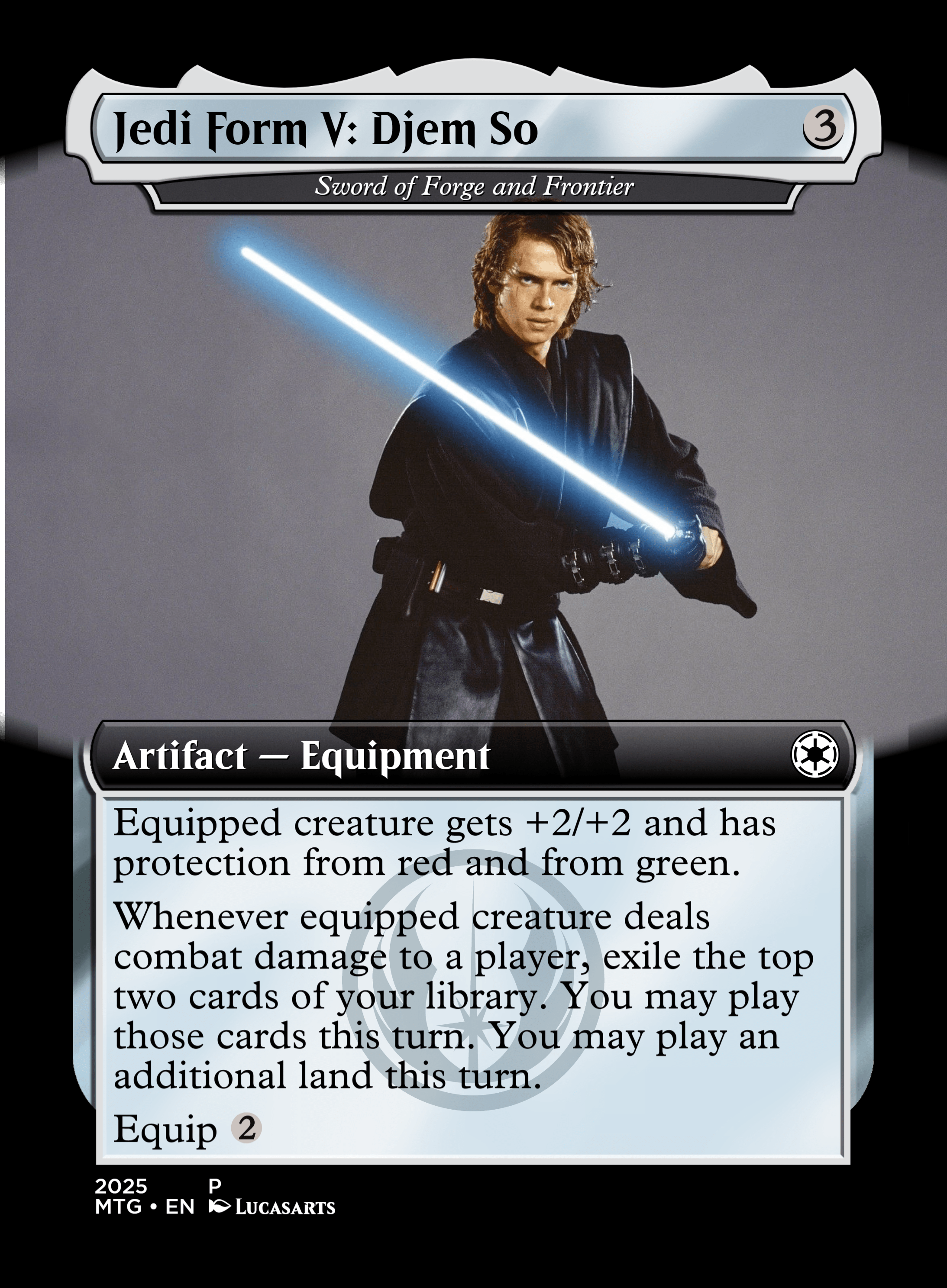 Whenever equipped creature deals combat damage to a player, exile the top two cards of your library. You may play those cards this turn. You may play an additional land this turn.