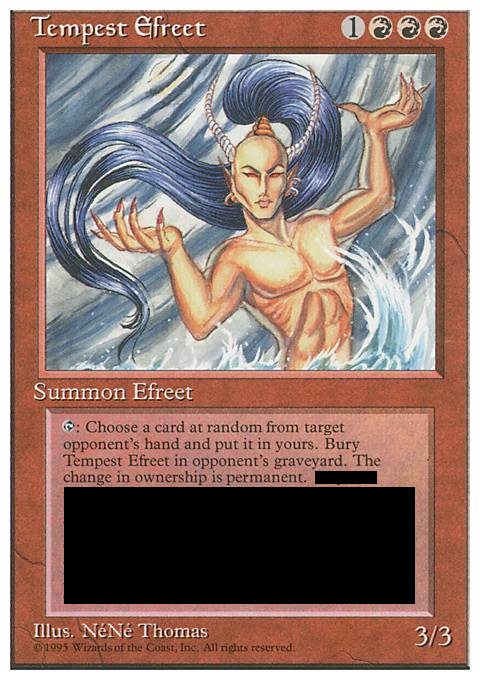 Tap, Sacrifice Tempest Efreet: Target opponent may pay 10 life. If that player doesn't, he or she reveals a card at random from his or her hand. Exchange ownership of the revealed card and Tempest Efreet. Put the revealed card into your hand and Tempest Efreet from anywhere into that player's graveyard.