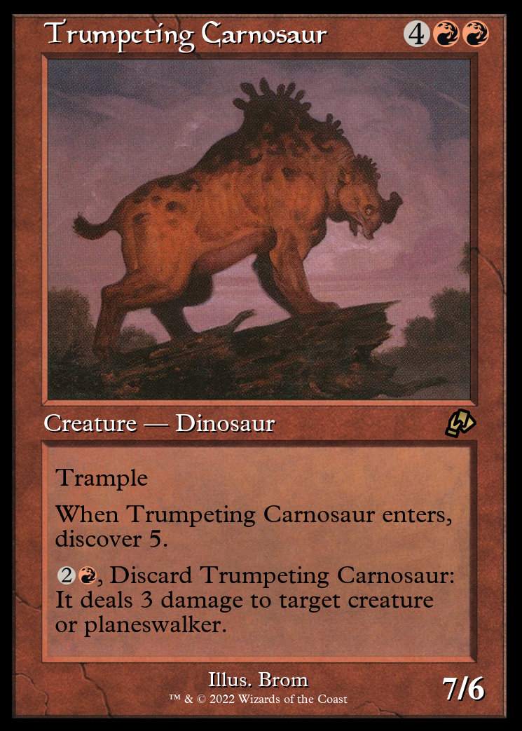 When Trumpeting Carnosaur enters the battlefield, discover 5. (To discover 5, exile cards from the top your library until you exile a nonland card with converted mana cost/mana value 5 or less. Cast it without paying its mana cost or put it into your hand. Put the rest on the bottom of your library in a random order.)