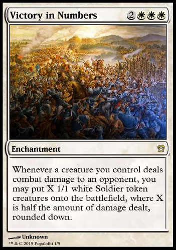 - Victory in Numbers wording: "Whenever a creature you control deals (combat?) damage to an opponent, you may put X 2/2 white (not capitalized; don't capitalize colors.) Soldier creature tokens onto the battlefield, where X is half the amount of damage dealt, rounded down.