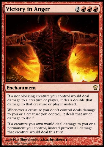 - Victory in Anger wording: Half of these are replacement effects, not triggers. So, from the top: "If a nonblocking creature would deal damage, it deals double that damage instead. Whenever a creature you don't own deals damage to you or a permanent you control, it deals that much damage to itself. If a creature you own would deal damage to you or a permanent you control, instead prevent all damage that creature would deal this turn."