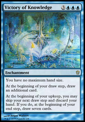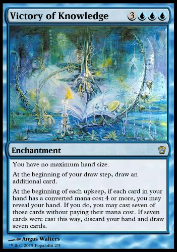 - Victory in Knowledge wording: First line should be the "you have no maximum hand size" bit. Then "At the beginning of your draw step, draw an additional card." And, finally, since this doesn't specify you playing with your hand revealed, I'm going to rework this as an activated ability, like so: "Reveal your hand: If each card in your hand has a converted mana (not capitalized) cost of four or greater, you may cast seven cards revealed this way without paying their mana costs, discard your hand, and draw seven cards."