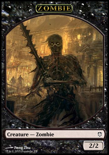 At the beginning of your upkeep, you put X Y/Z black Zombies onto the battlefield under your control, where X is the amount of Swamps you control, Y is the amount of creatures in your graveyard, and Z is your devotion to black.