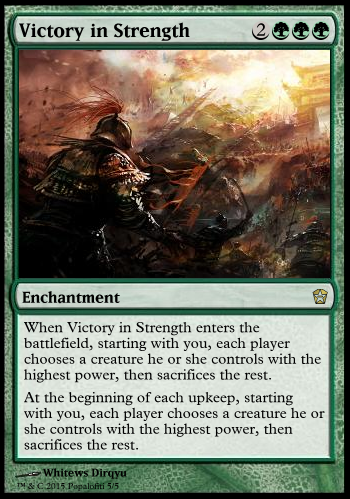 - Victory in Superiority wording: When ~ enters the battlefield, (Forgot this bit on the first bit of the card.), starting with you (The game rules require that this sort of thing goes in turn order anyway. You don't need to say so on the card.) each player chooses a creature he or she controls with the greatest power or the greatest toughness among creatures he or she controls and sacrifices the rest. (And then the second line is the same thing but instead it starts with "At the beginning of each upkeep".)